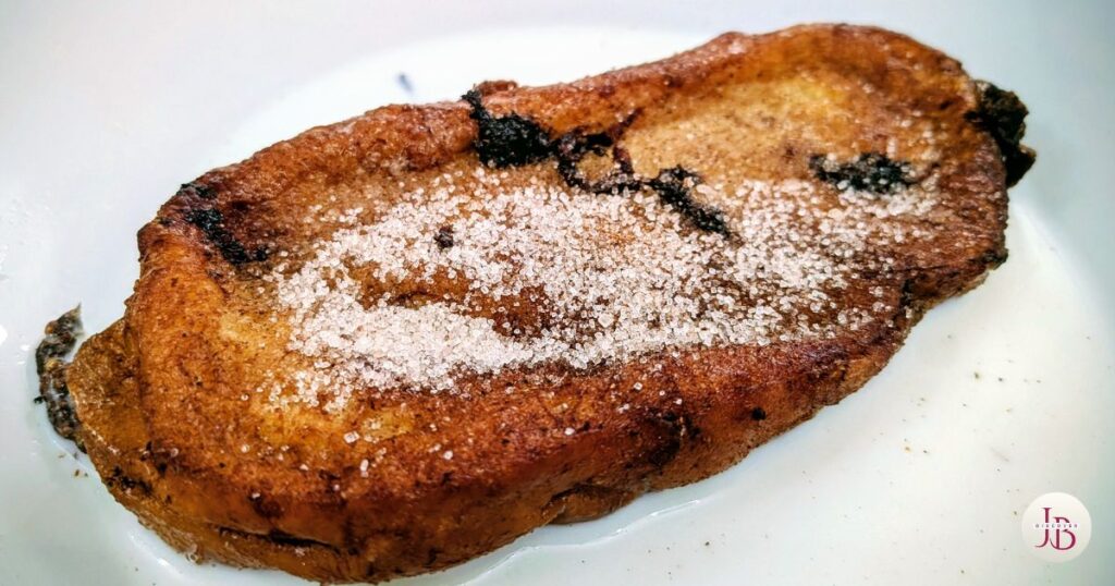 Traditionally, torrijas were a clever way to use up stale bread. A thick slice is soaked in milk infused with lemon peel and cinnamon or wine, dipped in egg, fried gently in olive oil, and finished with a dusting of sugar and cinnamon. The result is rich, comforting, and deeply nostalgic.
